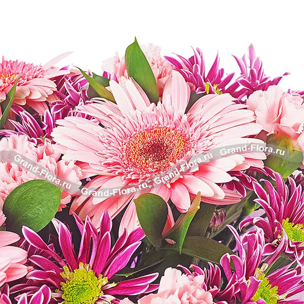 Уменьшенный: гербера розовая - 1 шт., гвоздика одноголовая розовая - 4 шт., хризантема кустовая фиолетовая - 3 шт., рускус, фетр фиолетовый.